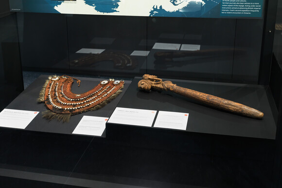 Objekte aus dem Ethnologischen Museum – Staatliche Museen zu Berlin. Links: Ein zeremonieller Brustschmuck, der auf Tahiti und den Gesellschaftsinseln bei kriegerischen Auseinandersetzungen von hochstehenden Befehlshabern zum Schutz und als Statussymbol getragen wurde. Rechts: Eine Stabkeule von der Osterinsel (Rapa Nui) mit janusköpfig stilisierten Gesichtern auf der Vorder- und Rückseite des Schlagkopfes.