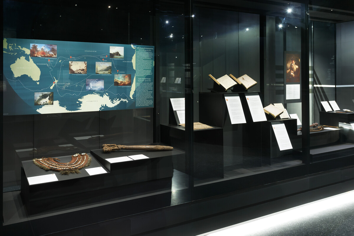 Ansicht der Präsentation „Captain Cook & Co. – 250 Jahre „Rückkehr aus der Südsee“ im Stabi Kulturwerk.